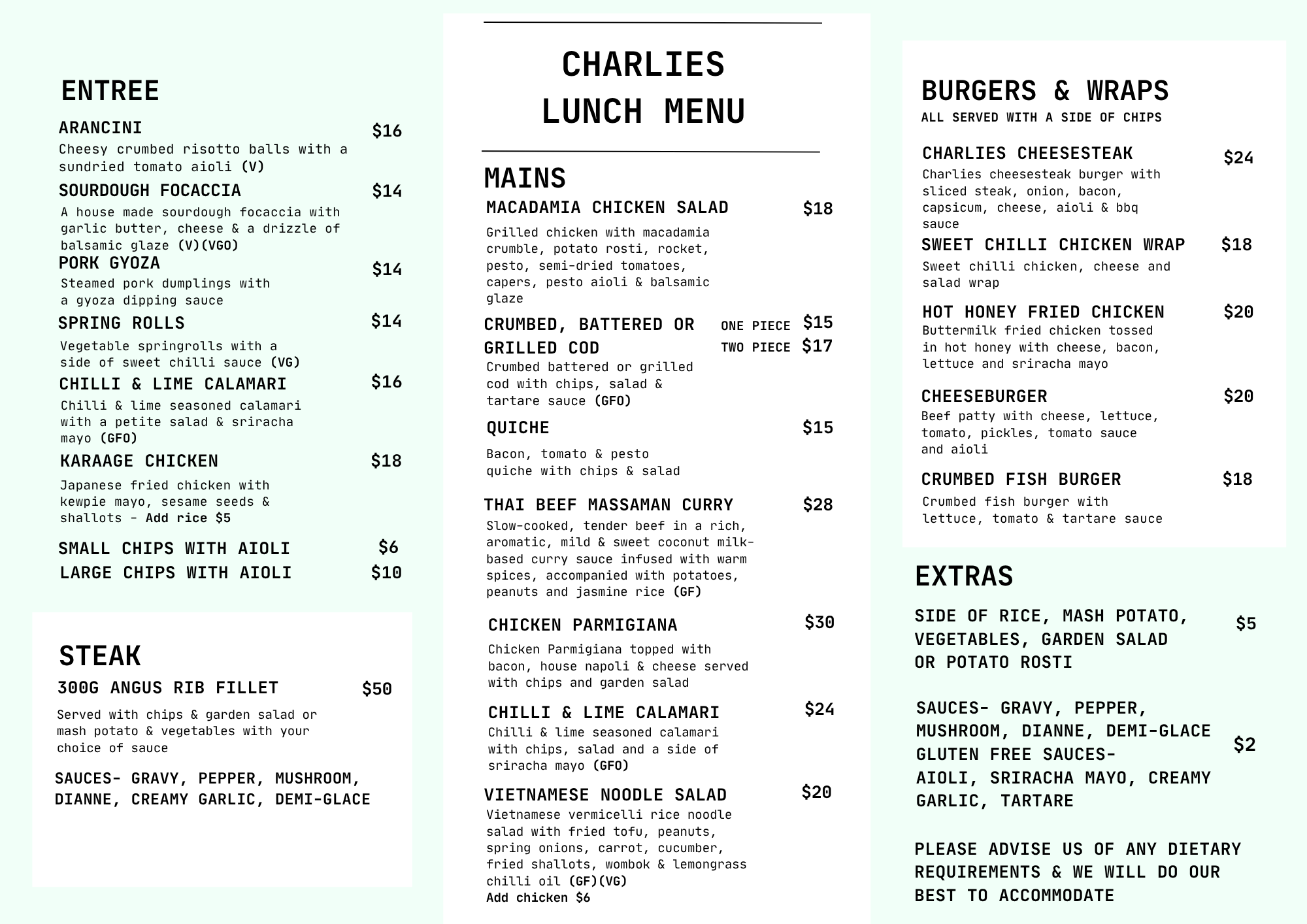 Welcome to Charlies Hotel Gympie. Located in the heart of Gympie we offer a great family friendly dining experience with dining either in the air conditioned comfort inside or in our spacious courtyard.